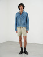 Denim meticulously woven on a shuttle loom using short-staple fibers dyed with rope dyeing on the warp and high-quality Supima cotton on the weft. By intentionally using short fibers on the warp, it achieves a rugged and softly vintage texture, while the use of long fibers on the weft creates an elegant fullness and soft feel.