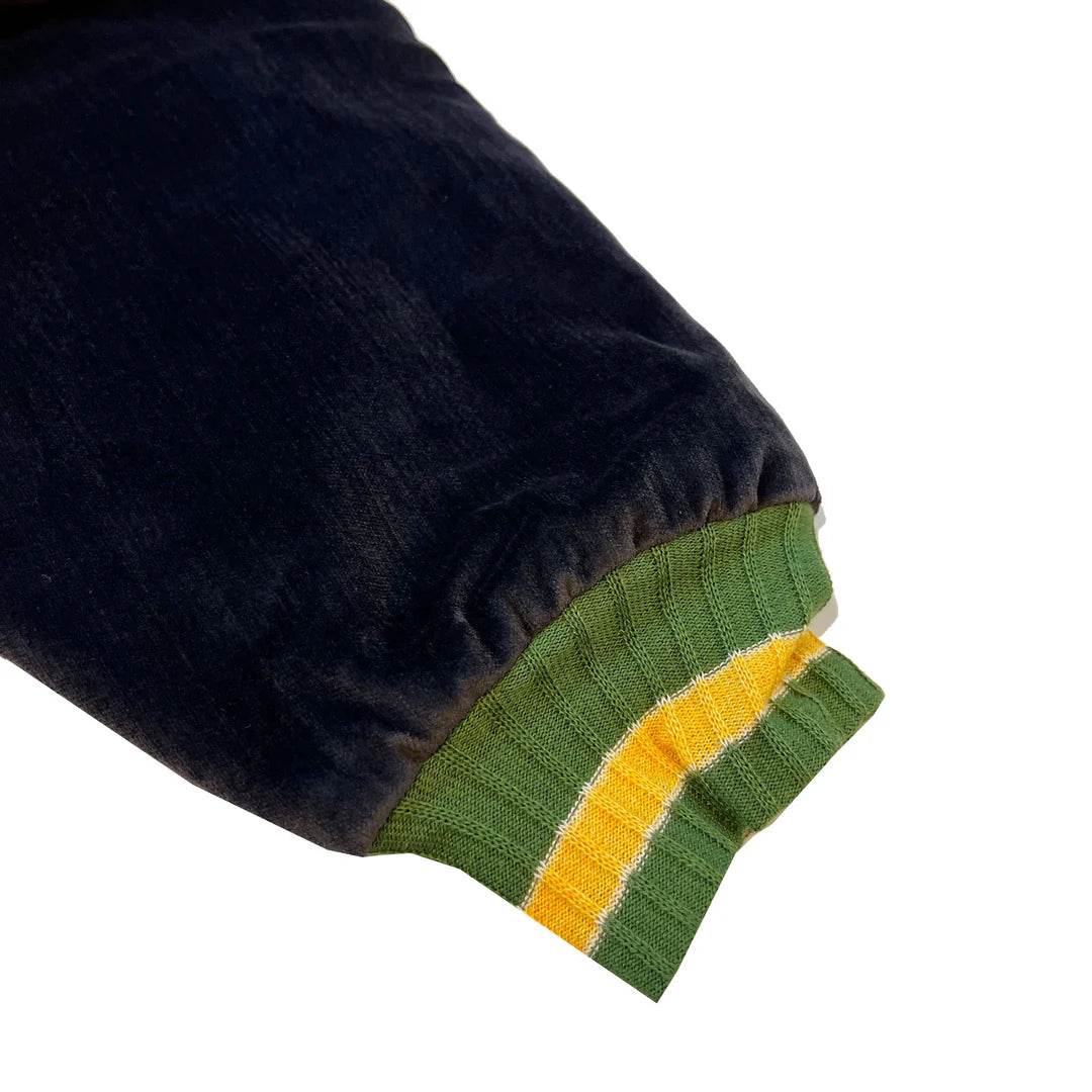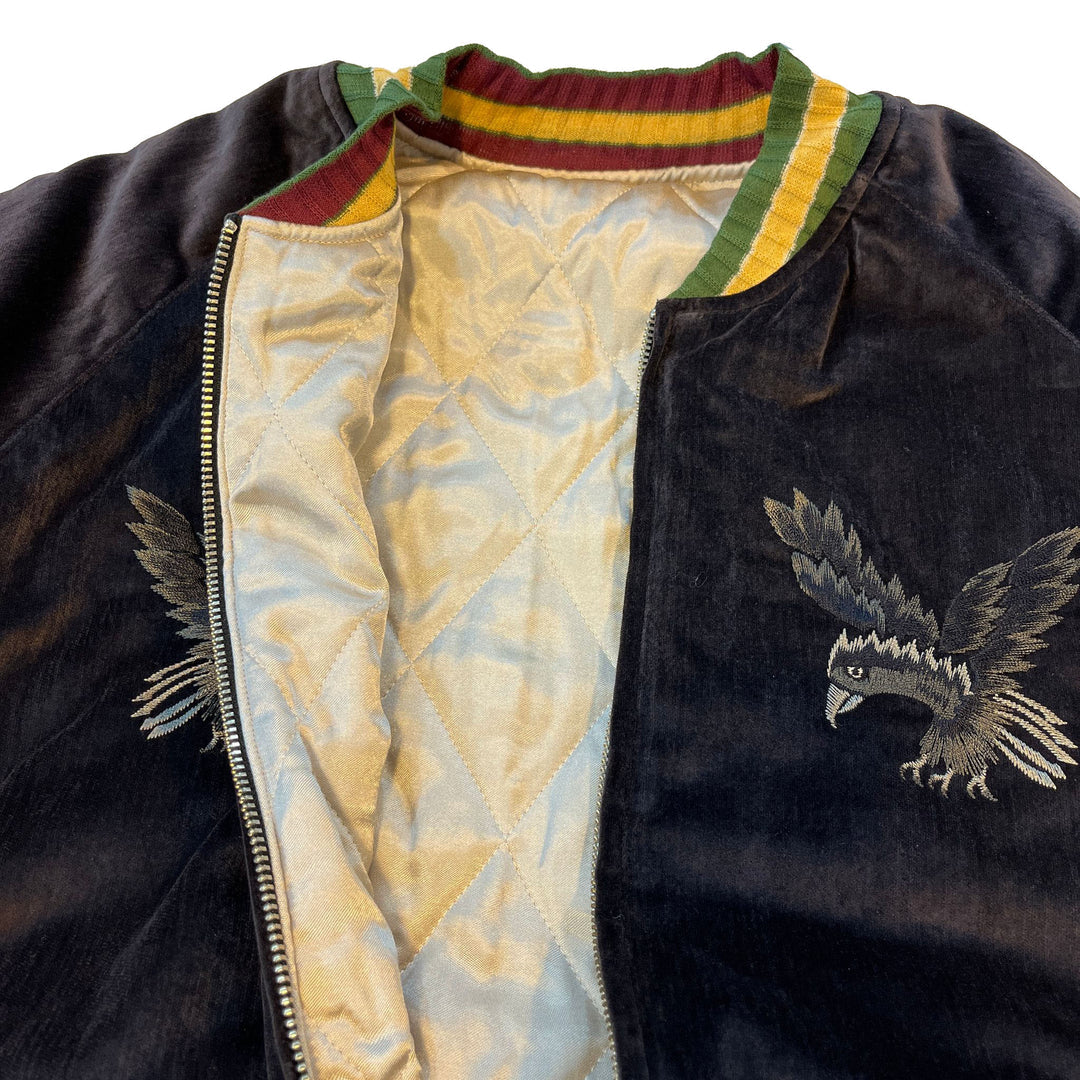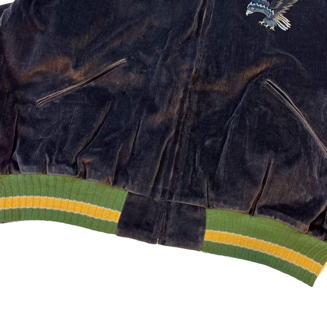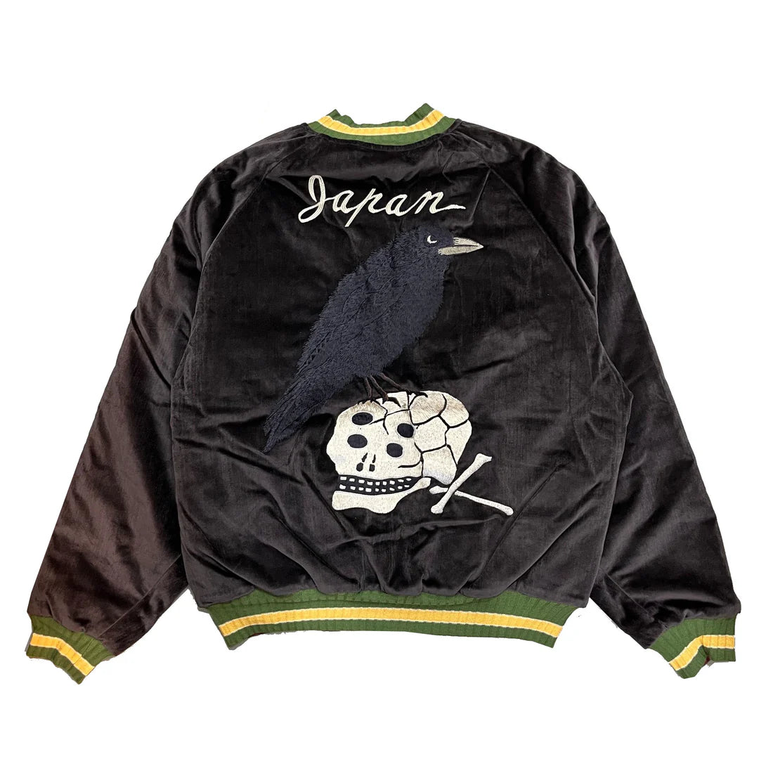 Crafted from lustrous sulfur-dyed velveteen, this jacket showcases an embroidered raven on the chest and a skull motif on the back. It is designed with a ribbed collar, cuffs, and hem, and offers a relaxed, wide silhouette for a refined yet bold look.