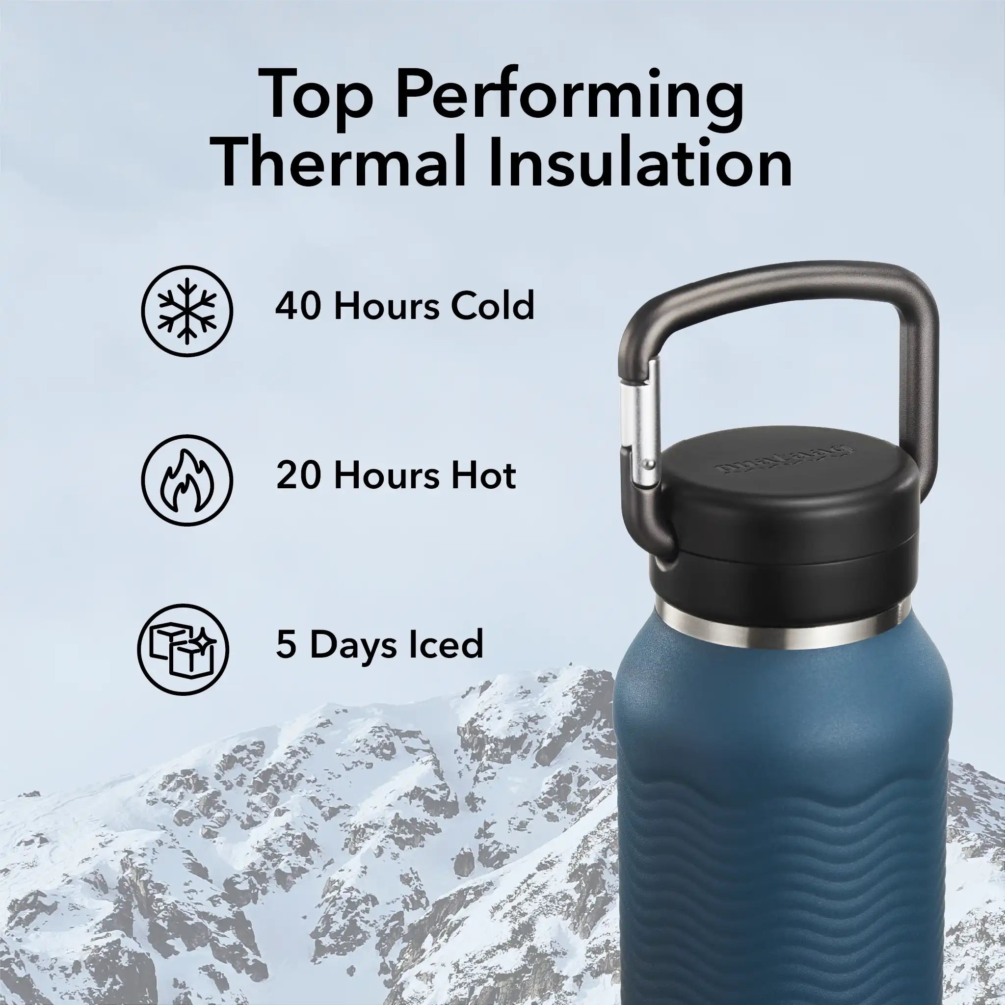 - Top insulation times: 40 hrs cold · 20 hrs hot · 5 days ice