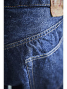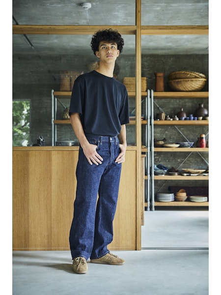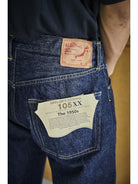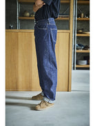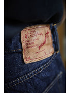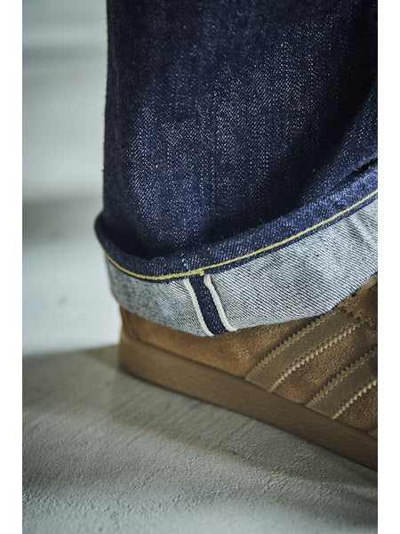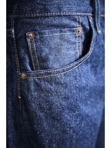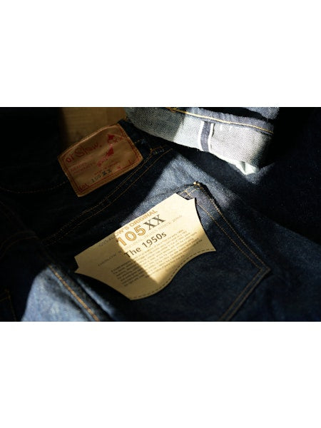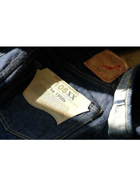 A model designed based on an analysis of jeans from the early 1950s. The denim, woven on vintage shuttle looms using yarn spun on a 1953 machine, develops a natural, uneven fade similar to that of 1950s jeans. For stitching, cotton thread is used, which blends well with the cotton fabric and undergoes aging over time, just like the material. Produced using manufacturing methods faithful to the 1950s, the side seams twist toward the right with wear. This is not a defect but a deliberate reproduction of the characteristics of jeans from that era. The silhouette will be slightly wider compared to our classic 105 STANDARD SELVEDGE DENIM.
