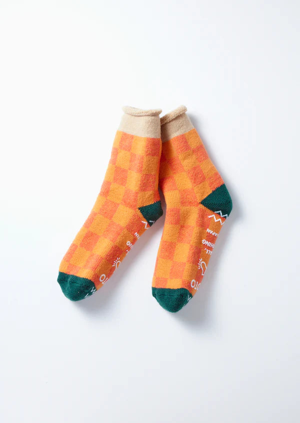 These room socks feature a striking, pop checkerboard pattern. Made with a wool and acrylic blend, the entire inside is finished with pile knitting for improved cushioning and warmth. The print on the sole provides a non-slip grip. *These socks are delicate. Please note that wearing them with stiff leather shoes may damage the fabric.
