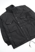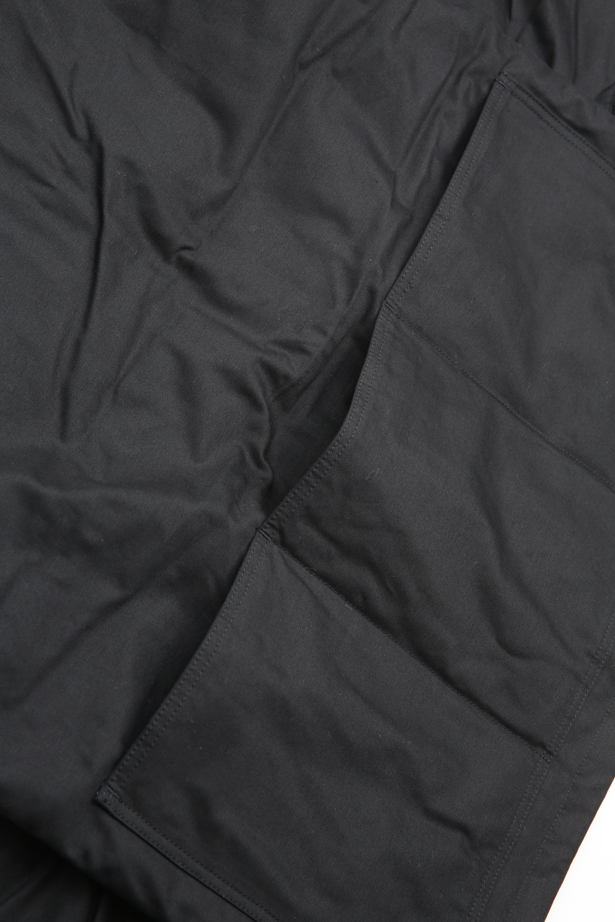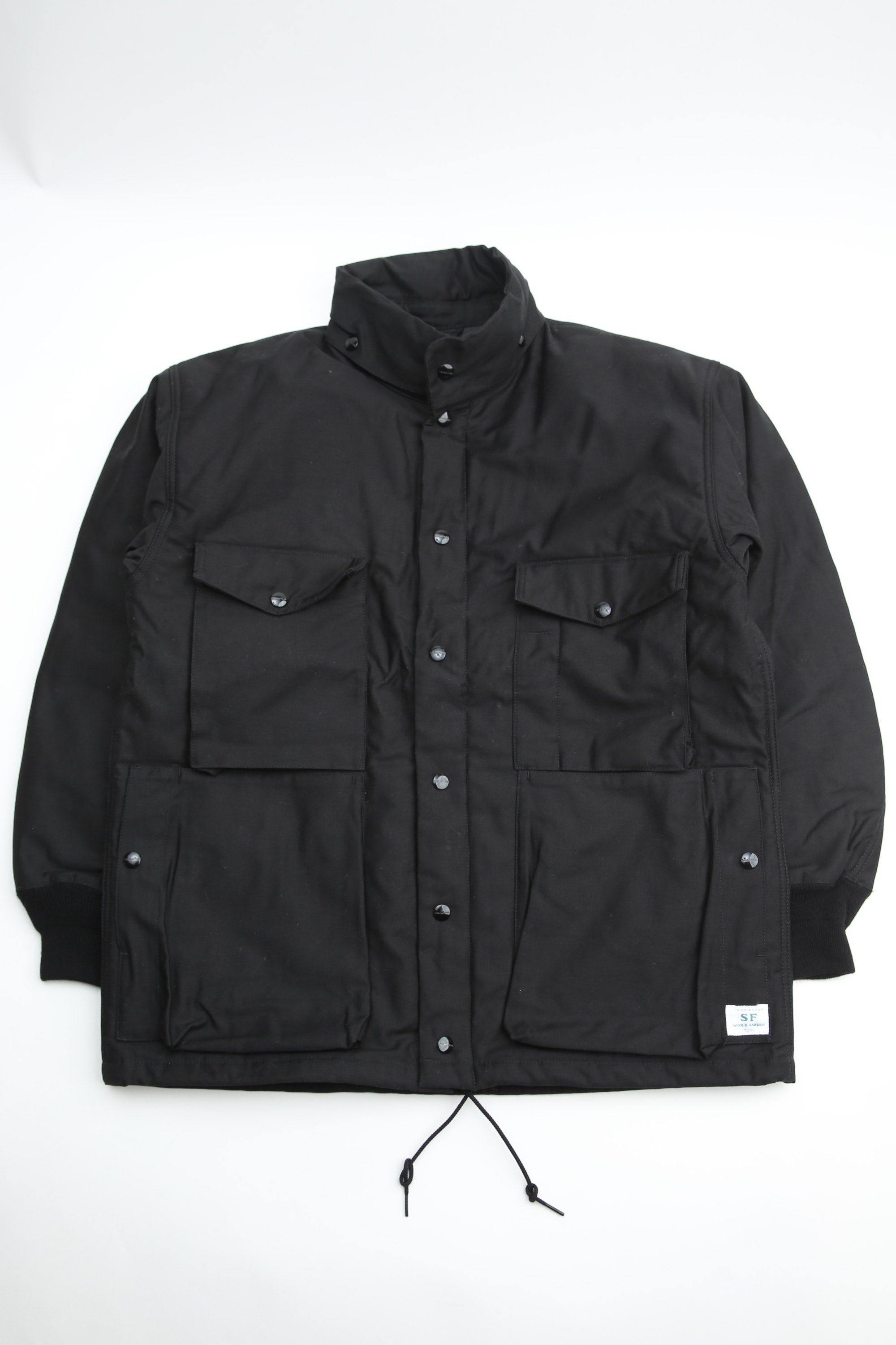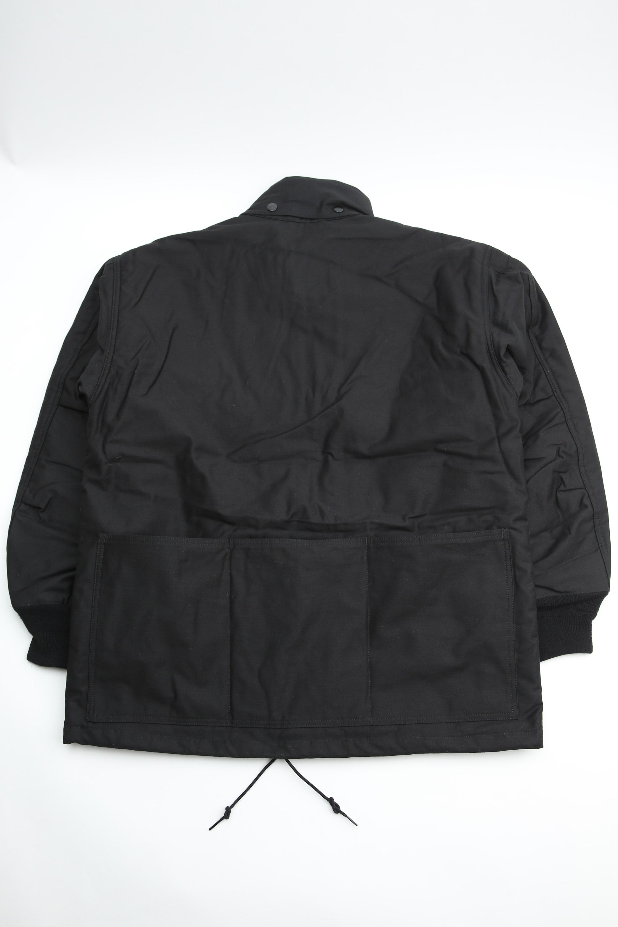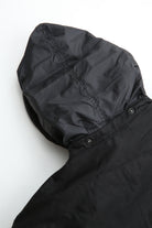 A new insulated jacket made from back satin fabric, it's based on the classic M-65. The collar is a stand-up collar with a hidden hood stow. There are pockets on the left and right front that have two compartments which can be accessed from the top or the side. There is also a large pocket with three compartments on the back. The cuffs are ribbed and filled with padding for warmth. The jacket fits wide to allow for additional layers to be worn underneath.