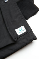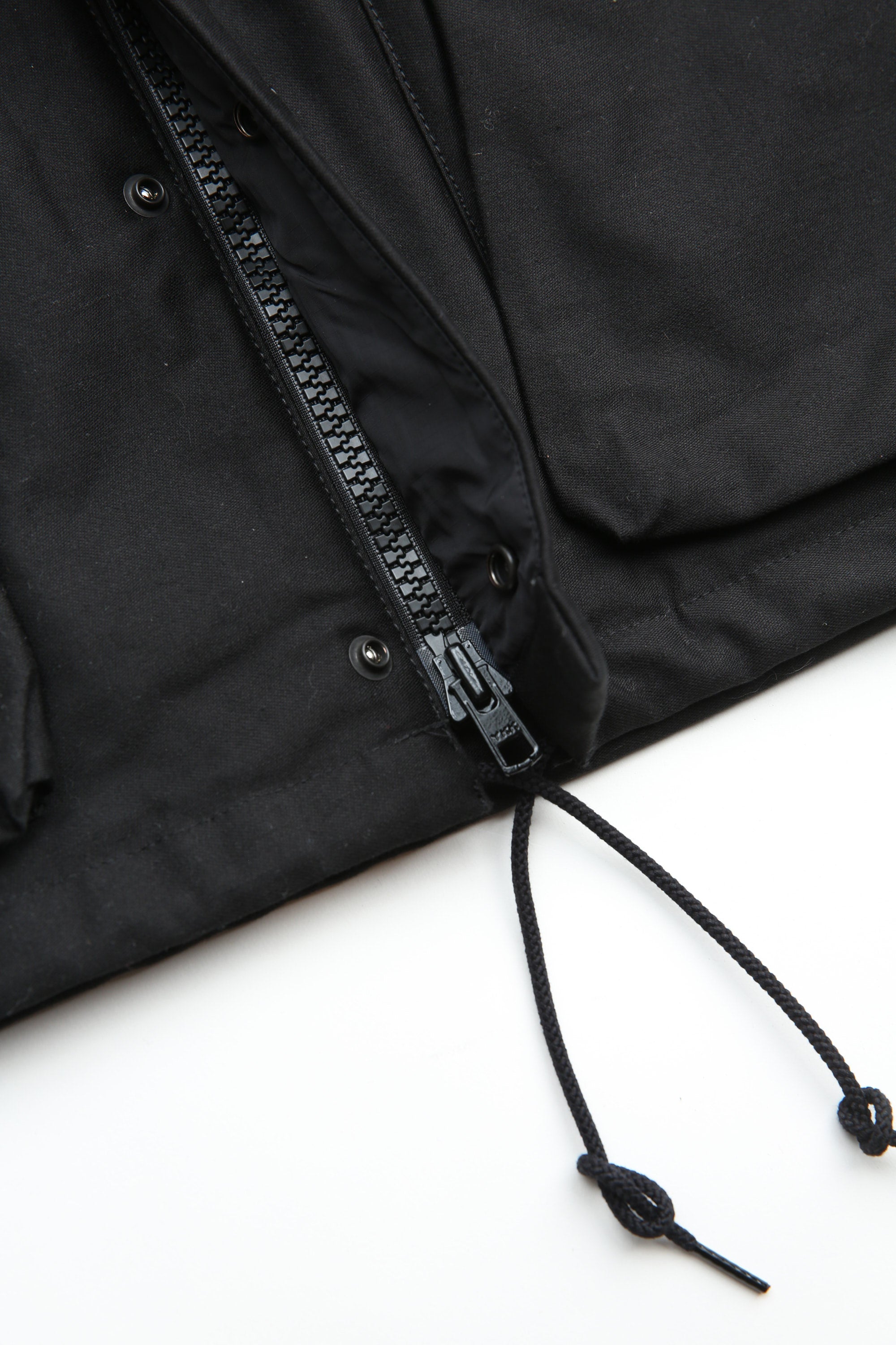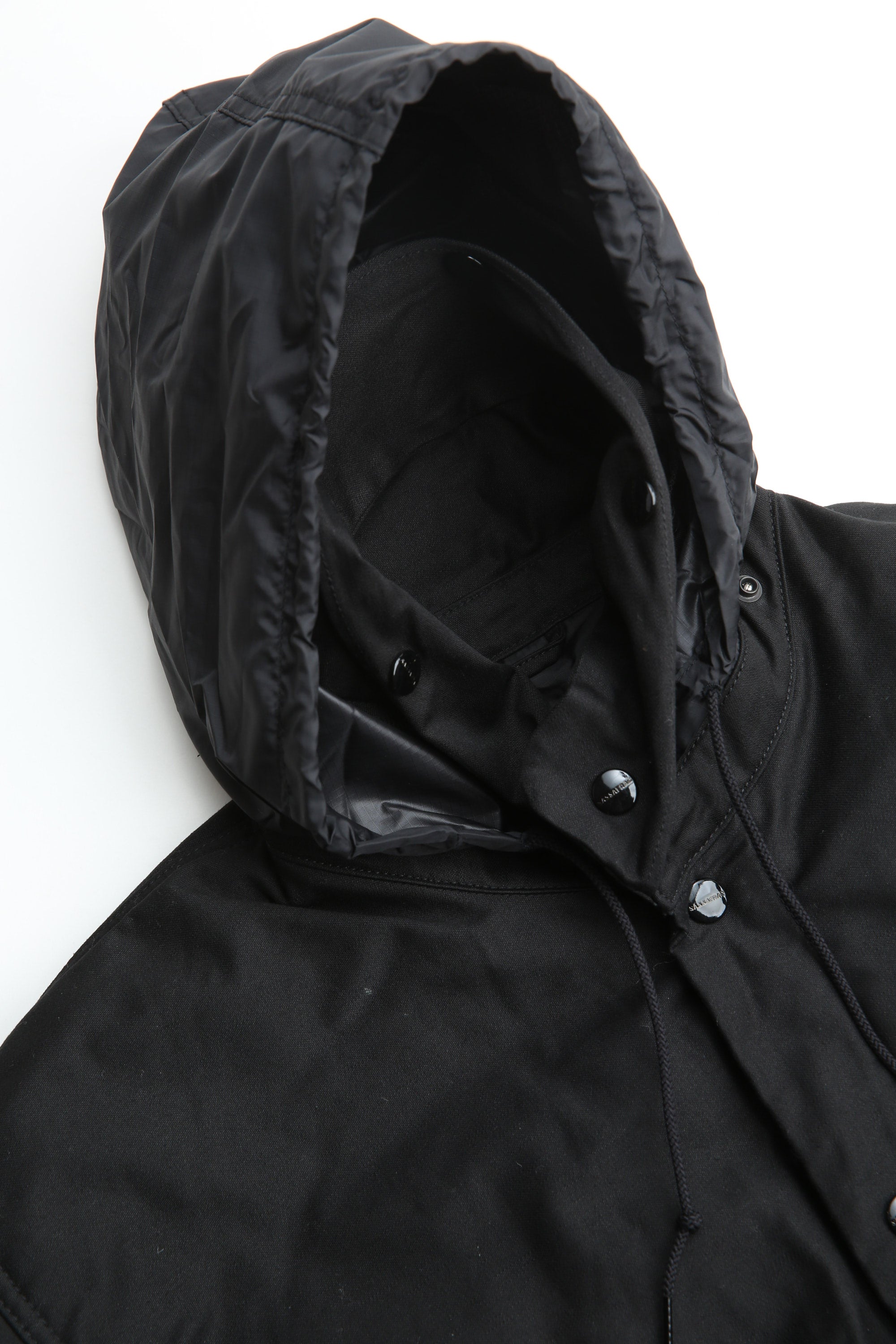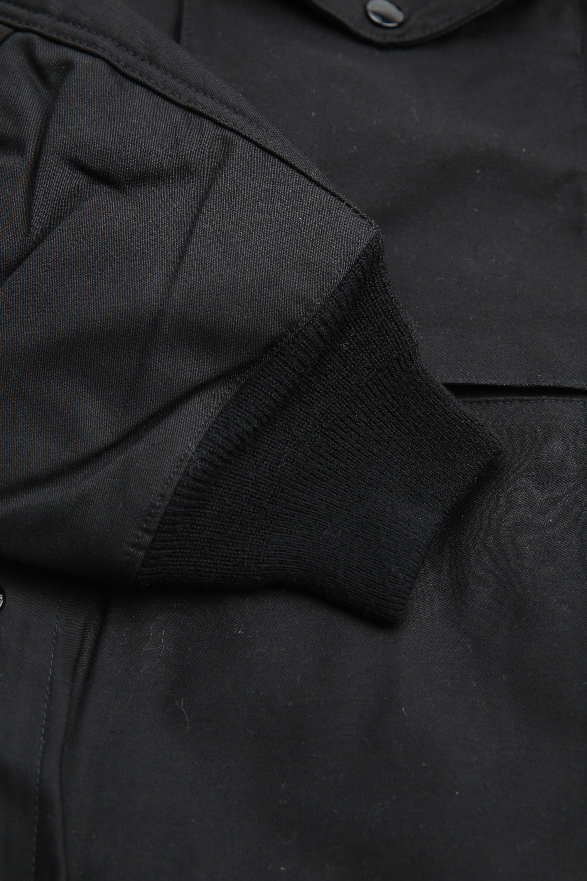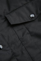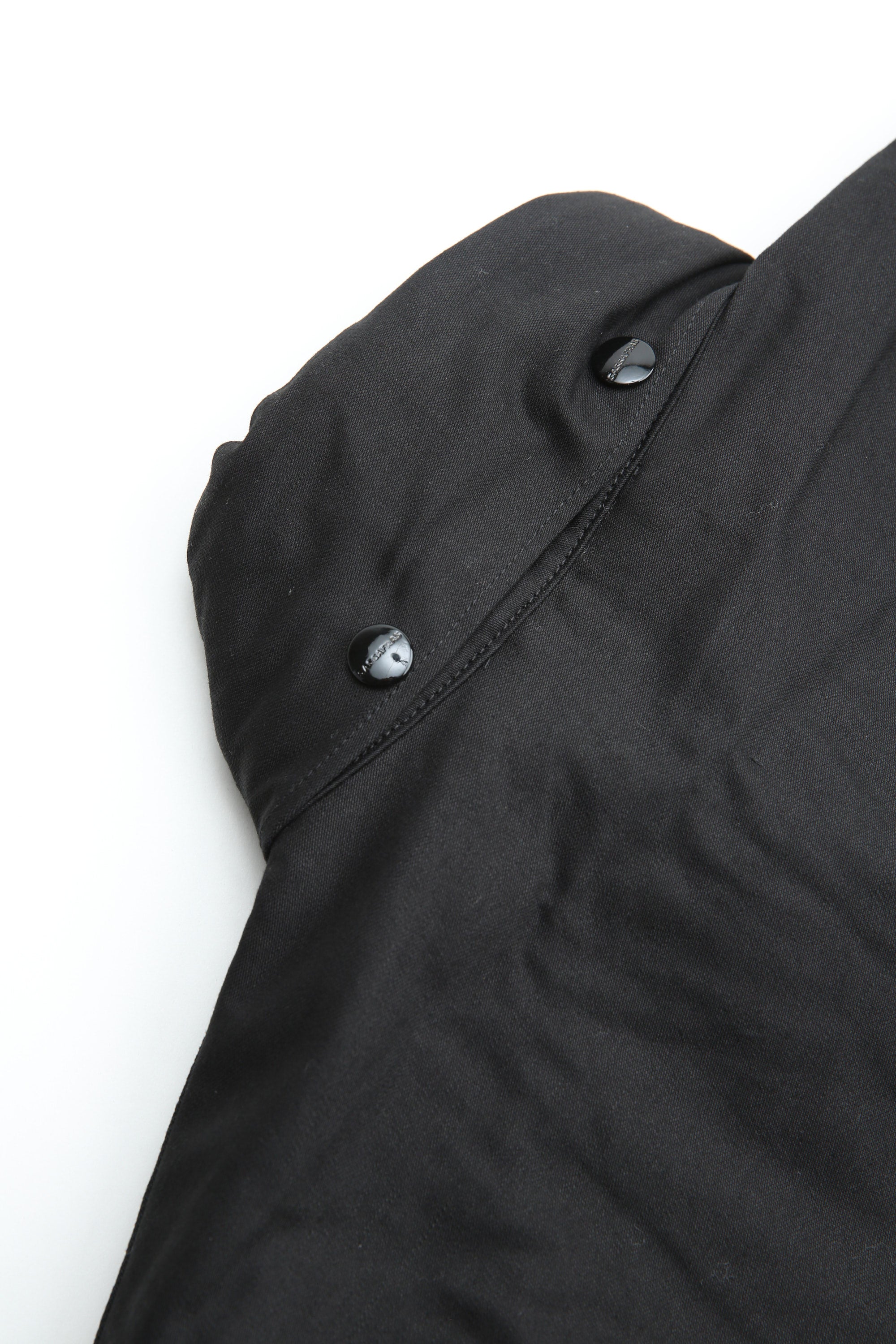 A new insulated jacket made from back satin fabric, it's based on the classic M-65. The collar is a stand-up collar with a hidden hood stow. There are pockets on the left and right front that have two compartments which can be accessed from the top or the side. There is also a large pocket with three compartments on the back. The cuffs are ribbed and filled with padding for warmth. The jacket fits wide to allow for additional layers to be worn underneath.